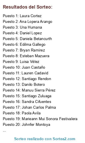 Lista de participantes: Alber Gonzalez, Ana Lopera Arango, Ana Maria Jessie Serna, Andreita Palechor O, Andrès Yepes Tabarez, Bryan Ramirez, Camila L. Roman, Camilo Liñan, Carlos Mauricio Gomez Muñoz, Carolina González Cañas, Criss Duran, Cristian Camilo Hidalgo, Cristian Monsalve Ocampo, Daniel Lopez, Daniel Maya Gonzalez, Daniel Romero, Daniel Trujillo, Daniela Betancurth, Daniela Mesa, Danilo Botero, David Acosta Diaz, Diana Elizabeth Acevedo Rodríguez, Edilma Gallego, Esteban Mazuera, Fernanda Gonzalez, Gabriel Jaime Netter Alvarez , Gloriana Velez Quint, Iván Portilla, Jaime Est RM, Jess Martínez, Jessica Garcia Velez, Jhonny Andres Garcia Noreña, Johan Camilo Suarez, Johan Carlos Palma, Johanna Cardona, Johanna Vasquez, John Sebastian Correa, Johnfer Montoya, Jorge Restrepo, José Estrada, Juan Castaño, Juan Martìnez, Juan Mejia, Juan Sebastián Rodríguez Díaz, Julio C. Castillo, Karen Ramírez, Laura Tobón, Lauren Cadavid, Lizeth Katherine, Luis Alberto Jaramillo Orozco, Luisa Ocampo, Luisa Vélez, Luz Mery Valoyes, Manuu Sierra Pérez, Marieann Mui Sonora Festivalera, Martïn Gonzälez Vivas, Mateo Cardona, Mateo Stiven, Melissa Morales Yepes, Miguel Cuadros, Monica Cuartas, Paola Avila, Pato Cadavid, Sandra Cifuentes, Santiago Rendon, Santiago Zuluaga, Sara Isabel Rengifo, Sebastian Jaramillo Jaramillo, Steven Alexis Sanabria Muñoz, Tabatha Carvajal, Una Humana, Victor Mendoza, Wilmer Alexis, Yune Alvarez, Laura Cortez, Andrés Gómez, Juan Manuel Vásquez Vivas, Maria Camila Gonzalez, .