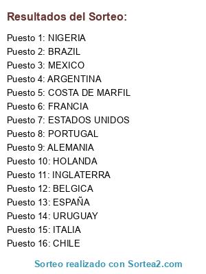 Lista de participantes: PORTUGAL, NIGERIA, ALEMANIA, ARGENTINA, BELGICA, BRAZIL, CHILE, COSTA DE MARFIL, ESPAÑA, ESTADOS UNIDOS, FRANCIA, HOLANDA, INGLATERRA, ITALIA, MEXICO, URUGUAY.