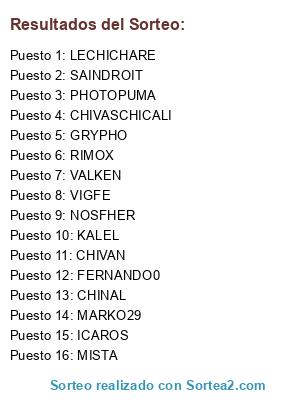 Lista de participantes: SAINDROIT, GRYPHO, PHOTOPUMA, ICAROS, MISTA, VIGFE, VALKEN, NOSFHER, CHIVAN, FERNANDO0, CHINAL, RIMOX, KALEL, MARKO29, CHIVASCHICALI, LECHICHARE, .