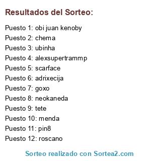 Lista de participantes: tete, adrixecija, obi juan kenoby, ubinha, menda, scarface, roscano, pin8, alexsupertrammp, goxo, neokaneda, chema.