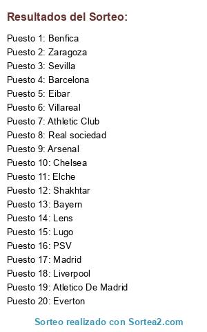 Lista de participantes: Real sociedad, Sevilla, Atletico De Madrid, Villareal, Elche, Barcelona, Madrid, Lens, Everton, Shakhtar, Eibar, Lugo, Arsenal, Zaragoza, Bayern, Benfica, PSV, Chelsea, Liverpool, Athletic Club.