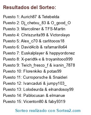 Lista de participantes: Pablocusan & elmanue, Vicenton80 & faby9319, Marcoliner & TFS-Martin, Alex_c70 & carlitooos18, Lolodeurda & elnandosoy99, Twich_fresco_f & ivanin_7878, Aurich87 & Tetebelda, Dj_chetxu_83 & O_good_O, Chriszurita99 & Victorolayo, Ivancaduti & jumpy103_, Euskalplayer & happyordonez, X-peridtk-x & troyanitooo999, Florenkiko & potas99, David4cib & rafamarillo64, Curroporsche & Snaideri.