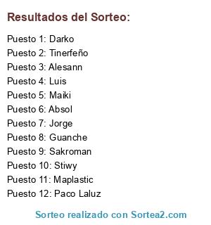 Lista de participantes: Sakroman, Jorge, Maiki, Stiwy, Alesann, Paco Laluz, Absol, Tinerfeño, Guanche, Luis, Darko, Maplastic.