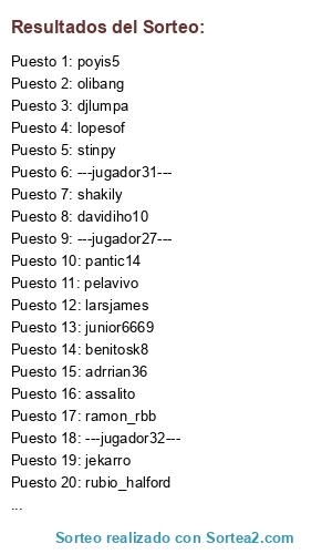 Lista de participantes: jaf_xtugos, tudels77, stinpy, madruga80, pantic14, valdepelayo, pelavivo, olibang, rubio_halford, assalito, cr9_javi, ramon_rbb, salem6669, jekarro, maritxurri, junior6669, poyis5, larsjames, ruchi17, adrrian36, shakily, djlumpa, davidiho10, lopesof, benitosk8, ---jugador26---, ---jugador27---, ---jugador28---, ---jugador29---, ---jugador30---, ---jugador31---, ---jugador32---.