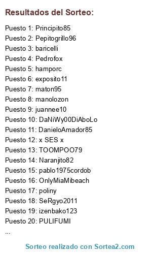 Lista de participantes: baricelli, Pedrofox, juannee10, colon666, brayanivan1990, Danivasp, Principito85, poyove, Jayoldi, MIKEY10 ElmalO, poliny, Pereirinho, TOOMPOO79, lobitooooo, x SES x, Pepitogrillo96, maton95, raulmar, DAVILON69, rastamanlasarte, hamporc, PULIFUMI, Murill069, SeRgyo2011, pablo1975cordob, delcampo88, TurfyTomas, puerto santiago, guss km, R0BLES7, heblesj, kikofer, SergioCollado, XxAfro8xX, exposito11, pakiu, manolozon, OnlyMiaMibeach, Ehos4, pablotp, CHAKAL1979, thecatonair, Naranjito82, SC carlicos69, DaNiWy00DiAboLo, slassi14, izenbako123, DanieloAmador85.