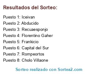 Lista de participantes: Florentino Gaher, Iceivan, Recuaesponjo, Abducido, Cholo Villaone, Capital del Sur, Frankicio, Rompeortos.