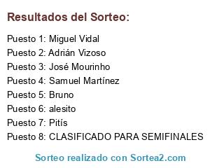Lista de participantes: José Mourinho, alesito, Adrián Vizoso, Miguel Vidal, Samuel Martínez, Bruno, Pitís, CLASIFICADO PARA SEMIFINALES.