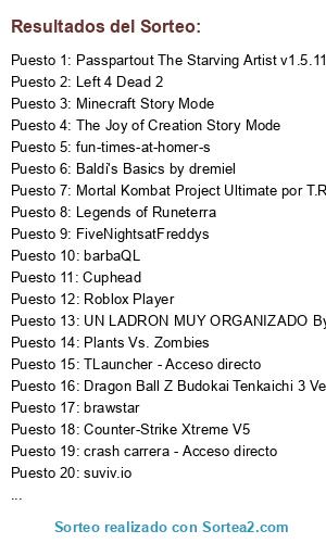 Lista de participantes: Brawlhalla , Baldi's Basics by dremiel , Plants Vs. Zombies , Broforce.Update.4th.7th.VeroxPiVi , Cuphead , fun-times-at-homer-s , TLauncher - Acceso directo , League of Legends , Passpartout The Starving Artist v1.5.11-TheSebas , Counter-Strike Xtreme V5 , GEOMETRY DASH 2.11 - ToplayAndrew , Emulador y Mario 3 By Dannyhbk10 , Left 4 Dead 2 , Crash Bandicoot - R-91 , Minecraft Story Mode , Legends of Runeterra , UN LADRON MUY ORGANIZADO BySoyJoakoYT , Mortal Kombat Project Ultimate por T.R , TJoC- R Beta 0.1.0 , Roblox Player , FiveNightsatFreddys , StormzPlays , The Joy of Creation Story Mode , Dragon Ball Z Budokai Tenkaichi 3 Version Latino , crash carrera - Acceso directo , suviv.io , barbaQL , brawstar , youtube.