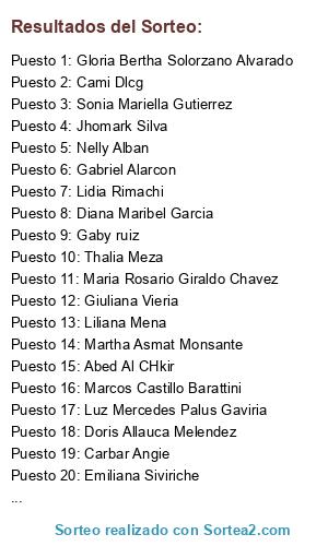 Lista de participantes: Iris Ravines Diaz, Karla Alava, Flora S Garcia, Adriana Trujillo, Luz Mercedes Palus Gaviria, Margarita Granados, Nelly Alban, Ana Ce Ahumada, Almendra Prado, Paola Martinez Arteaga, Maria Rosario Giraldo Chavez, Judith Garcia Meza, Diana Salazar, Geraldine Luz, Beatriz Carreño Reyes, Adriana Pamela Abanto De la cruz, Haruka Ruth Meza, Marlene Cerna, Sergio Saamir Caceres Boza, Diana Maribel Garcia, Emiliana Siviriche, Marco Antonio Rivas, Ana Araceli P, Margarita granados, Jhomark Silva, Mercedes Gala, Giuliana Vieria, July Elias, RB Marilyn, Gina Aldarete, Sumil Jihuallanca, Daniela Tordoya, Itala Alvarez, Martha Asmat Monsante, Lydia Vega, Cami Dlcg, Jackelin GQuiroz, Renato Ponte, Carla Centii, Kary Guadalupe Mesia Tirado, Karina Gamarra Amaro, Stephannye Ramirez, Alicia Herencia Ortega, Victor Eduardo Villafuerte Robles, Abed Al CHkir, Johana Chavez Santa Maria, Vannessa Jenny Saavedra, Lidia Rimachi, Yolanda García de Samanez, Monica Samanez Garcia, Claudia Isabel Loza Carreño, Susana Samaniego, Guillermo Beimar Benites Tutusima, Sonia Mariella Gutierrez, Angie Tica De contardo, Julio Amador Melendez Zarate, Doris Allauca Melendez, Carmen Giraldo Chavez, Ana Karina Castillo M, Julia Carreño, Silvana Centti, Gabriel Alarcon, Roxana Yvonne Ramos, Lilly Morales, Francis Rojas, Efrain Espinoza, Liliana Mena, Carbar Angie, Thalia Meza, Gaby ruiz, Marcos Castillo Barattini, Dairis Nicole Chavez, Cecilia Samanez, Gloria Bertha Solorzano Alvarado, Carmen Pacheco, Olga Maguiña Jordan, Maria Rojas Bailon, .