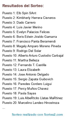 Lista de participantes: Luis Javier Merino, Luis AlbeRtcito Llatas MaRtinez, Alberto Matta, Meli Ssa, Cecilia Abad, Phillip Ramos Sequeiros, Gustavo Garcia Salas, Joe Chillihua, Mercedes Bacilio Avila, Enrique Rodríguez Rojas, José De La Cruz, Kimbherly Herrera Cisneros, Christian Gutierrez Soto, Hernan Rado Irazabal, Ivan Escobedo, Daniel Galvez Estrada, Raul Ernesto Martinez, Elizabeth Vanessa Blanco Vidal, Dado Carrero, Carlos Diaz Silva, Ernesto Sarmiento, Maria M. Irazabal Herrera, Vladimir Chavez, Carla Atoche Herrera, Kike Cayetano, Lourdes Yamunaque Regalado, Jorge Carlos Gutierrez Palomino, Jose Caycho, Evelyn Palacios Felices, Yesenia Flores, Sergio de los Ríos Pacheco, Lesther Ari Contreras, Percy Muños Chavez, Jose Antonio AN, Alberto Arturo Custodio Carbajal, Christian Alejandro Chavez Zambrano, Juan Condori Olivo, Martha Belleza, Marcelino Landeo Hinostroza, Magaly Amparo Moreno Pineda, Rocio Ore, Cristian Heredia, Luis Enrique Vigil, Romy Vanessa Arrieta Vela, Elizabeth Ampudia, Mario Heredia, Yofre Heredia, Luis Palomino, Laura Elizabeth, Cinthya Colan Rey, Martha Asmat Monsante, Paul Zapata Surco, Paul Anderson Moreano Gómez, Jessica Llanos Morales, Juan Jose Diaz, Heber Manuel Montesino Arias, Joselin Rodriguez, Jose Luis Alvarado Veliz, Elb Spin SAnt, Michael Maikeru Ca, Rodrigo Del Solar, Luz Leon, Paredes Cordero Luigui, Roxana Veronica Huertas Ponce, Alfredo Malpartida Velasquez, Fiorella Andrea Briceño, Luis Enrique Contreras Torres, Fernando Tasayco Mendoza, Antonio Mendoza, Fernando T. Castilla, Claudita Tasayco Mendoza, Rosalinda Mendoza Sigueñas, Isaac Duberly Aquise Aranya, Francisco Panta Beramendi, Sergio Zapata Guibovich, T Delzo Espinoza, Paola Sayas, Frank Anderson Mendez Albornoz, Henry Black, Carlos Enrique Salazar Farias, Jose Antonio Delgado, Jorge Luis Mendoza Zevallos, Diana Marleny, David Olarte Arévalo, Lau Guillen Mendoza, Edgard Alejos, Boris Edwin Jiraldo Gamarra, Juan Siesquen, Doris Luz Pantoja, Alex Evaristo, José Luis Reyes, Maria Del Pilar Marin.