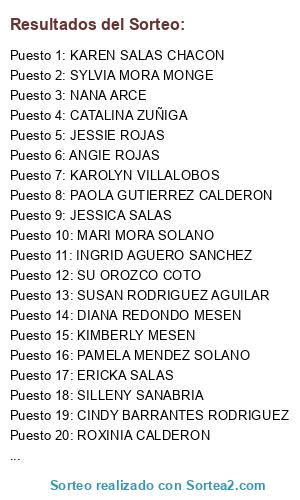Lista de participantes: JESSIE ROJAS, SYLVIA MORA MONGE (2 participaciones), KAROLYN VILLALOBOS (2 participaciones), DIANA REDONDO MESEN (2 participaciones), KAREN SALAS CHACON(2 participaciones), PAOLA GUTIERREZ CALDERON (2 participaciones), SUSAN RODRIGUEZ AGUILAR (2 participaciones), SU OROZCO COTO, ANGIE ROJAS (2 participaciones), MARI MORA SOLANO (2 participaciones), KIMBERLY MESEN, ROXINIA CALDERON, PAMELA MENDEZ SOLANO, JESSICA SALAS, SILLENY SANABRIA, INGRID AGUERO SANCHEZ, CATALINA ZUÑIGA, NANA ARCE, ANGIE TORUÑO, RAQUEL MADRIGAL, CINDY BARRANTES RODRIGUEZ, ERICKA SALAS.