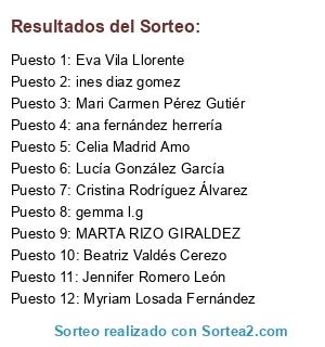 Lista de participantes: Sandra Alvarez, Blanca Serrano, Lola Carpio, SHEILA DIAZ, Teresita Baños Peña, Zulema Pontes Vidal, Laura Suria, Amelia Salinas Villalba, Carmen García Moreno, Maite Sevilla del Pozo, Marcela Orrego Vergara, Eva Turrero busto, silvia ortega olmo, Àngela Carrió, ana ramos, Beatriz Marcelo Perea, MELISSA PEREZ GALLEGO, Rosa Jerez Escolano, Elena Rodriguez Gonzalez, Monica Prieto Garcia, Vicky Megias Jimenez, gladys perez prieto, ines diaz gomez, Luz Victoria Muñoz Saura, Susana Pinos Hernández, Déborah Taboas Garcia, Rosa Mª Para de Andres, elena carmen calderon revilla, milagros gonzález, angeles ramos, Yolanda Gómez Cacheiro, Estrella Moreno Díaz, Agar Galea Barrena, Xisca Rotger, Victoria Nava, silvía gimenez, Nuria Macías García, SANDRA ZARINA, LORENA CIFUENTES MARTÍNEZ, Núria Salamaña, Nieves Paz Gestoso, carmen morales, María Labrador Martín, maria eugenia arias lozano, Rosario Rosendo Guerra, Montse Prieto Martínez, Tamara González, Mariluz Rosales Rosas, Beatriz Valdes Cerezo, tere cano garcia, Yolanda Isabel Hurtado Garcia, Alicia Pérez, Carmen Zapico Zapico, Pepi Baenas Sanchez, Maria Gemma, Andrea Ripa Araiz, Veronica Gonzalez Lopez, Chari Rodríguez Gordillo, Maria Jose Martinez Gomez, Jose Javier Nieto Onsurbe, Carmen Trujillo Poveda, Yolanda Chicote, Natalia Puglisi, Montse Maceda, Maria cortés, Lucía Martínez Barral, María del Mar Saelices González, Sara Mínguez Andrés, Cristina Rodríguez Álvarez, abigail López, Elena Knyazhechenko, Domingo Carrique, Belén Gallardo Callejón, Magdalena Alonso Otero, Evamar Llopis, Raquel Cano Soler, Marina Soler Martín, Lara García-Granero, Nuria García Gonzalo, Carmen María Ayuso Revaliente, Eva Fontans Rilo, Lorenzo Cano Soler, MARTA RIZO GIRALDEZ, Eva Ortiz San Jose, ana fernández herrería, sara juanes, Xandra Miguelez Mendez, dolores soler rodriguez, Eva Vila Llorente, VERONICA PEREZ PEREZ, maria jose quiles rivas, Soraya Rodriguez Baena, alfonsina arizaga veliz, maite floriani gonzalez, Mónica Casas Angullo, encarnaciòn cindado gomez, Ana María Godoy Durbán, Omayra González, Elena Borjabad Lozano, Silvia Bartolomé Macías, Rosa María Sierra Alvarez, Nuria Garcia Buendia, rosi jabalera rodriguez, ana espejo toro, Maria del Carmen Hernandez Mendez, Lorna Bao Busquet, Mª José V. P., Celia Madrid Amo, NAGORE AROSTEGUI ROJO, VANESSA DE HARO ROMERO, Ana Pérez Martínez, sara lozano, Belén Díaz-Terán Gonzalez, Maider S., Begoña Moreno Robles, Laura Moreno Robles, maria martinez blanco, patricia fraga martinez, Carmen Ródenas Marín, Ignacio Eleazar Marceca, CARMEN CORRIOLS FERNANDEZ, Sefora Martinez Suarez, Maria Rodriguez Morales, Beatriz Valdés Cerezo, Mª del Mar Cervantes Villalobos, Silvia Miguélez Blázquez, Esmeralda estevez rincon, gemma l.g, Aurora Cuesta Valle, CRISTINA Banzo, JUDIT MARTIN PORRAS, patricia espada sesar, Lorena Ramos, Laura Pérez Castro, Jaime Torralba, Mari Carmen Pérez Gutiér, Idaira Hernandez Hernandez, Josefa Hernandez Santana, maria wasmer romero, María Yolanda González Lucas, MARIA FERNANDEZ CORRIOLS, yessica Del Amo Sanchez, Katerina Knyazhechenko, Miriam Rodriguez Payo, eva lopez gutierrez, maria lópez iglesias, Ana Belén Martín, Lourdes Dinares Marcos, Diana Aguado Menéndez, Sergio S. Garcia, FELISA CASTILLO DIAZ, Esther García Asencio, Ursula olmedo muñiz, Inma Puertas Esquivel, Inmaculada Valdivia Saez, Myriam Losada Fernández, Eva Mérida, María Carmen Pérez Gutiérrez, Marta Llamazares Villadangos, CHUS FERNANDEZ, Nerea Brito, María Moreira, Alba Moreno, Belén Moreno Poveda, eli guerrero, Cristina Lagares, María Ramos Gil, Lucía González García, arianne baniela gonzalez, Jennifer Romero León, Lupita Romero, Pili Alastrué Javierre, Natalia Pérez Pérez, Rosa María Giménez Casmatiño, Sara Perez, Andrés Pérez Pérez, maria felipa perez sanchez, irene merino, Susana perez perez, Begoña Tejada Herreros, BEATRIZ LASTRA SANCHEZ, Lourdes Fabiola perez zamudio, Margarita Sañudo Borbolla, Simón Vallejo Sañudo, Adilia Vallejo Sañudo, César Vallejo Herrero, Lucia Pérez Pérez, Isaac Perez Velazquez, MARIA JOSE BLANCO CORDOBA.