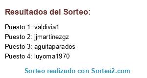 Lista de participantes: aguitaparados, esteticamedicaenf, jenoir2, jjmartinezgz, jump_uk, leybey429, los_patillas_, luyoma1970, manuanchez1, marihelyta, samo.maria, tobiaspernia, valdivia1.