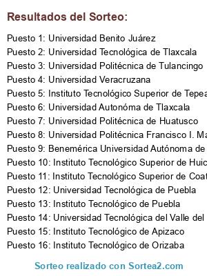 Lista de participantes: Universidad Politécnica Francisco I. Madero, Universidad Tecnológica del Valle del Mezquital, Instituto Tecnológico Superior de Huichapan, Universidad Politécnica de Tulancingo, Benemérica Universidad Autónoma de Puebla, Universidad Tecnológica de Puebla, Instituto Tecnológico de Puebla, Instituto Tecnológico Superior de Tepeaca, Universidad Autonóma de Tlaxcala, Universidad Tecnológica de Tlaxcala, Universidad Benito Juárez, Instituto Tecnológico de Apizaco, Universidad Veracruzana, Instituto Tecnológico Superior de Coatzacoalcos, Universidad Politécnica de Huatusco, Instituto Tecnológico de Orizaba.