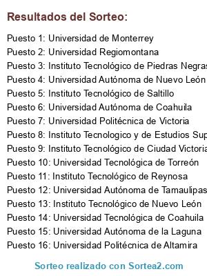 Lista de participantes: Universidad Autónoma de Coahuila, Instituto Tecnológico de Piedras Negras, Universidad Tecnológica de Coahuila, Instituto Tecnológico de Saltillo, Universidad Autónoma de Nuevo León, Universidad de Monterrey, Universidad Regiomontana, Instituto Tecnologico y de Estudios Superiores de Monterrey, Universidad Politécnica de Altamira, Universidad Politécnica de Victoria, Instituto Tecnológico de Ciudad Victoria, Universidad Autónoma de Tamaulipas, Universidad Tecnológica de Torreón, Universidad Autónoma de la Laguna, Instituto Tecnológico de Nuevo León, Instituto Tecnológico de Reynosa.