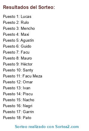 Lista de participantes: Mencho, Garrin, Lucas, Maxi, Omar, Rulo, Guido, Facu Meza, Facu, Ivan, Agustín, Pato, Nacho, Negri, Héctor, Piscu, Mauro, Santy.