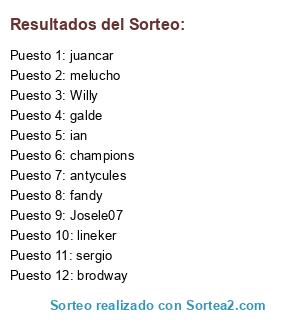Lista de participantes: Willy, Josele07, antycules, sergio, champions, melucho, lineker, ian, brodway, galde, juancar, fandy.