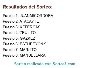 Lista de participantes: MARLITO, ESTUPEYONK, JUANMICORDOBA, MANUELLARA, GAZKEZ, KEFERGAS, ZEULITO, ATACAYTE.