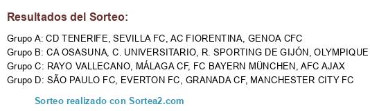 Lista de participantes: AFC AJAX, FC BAYERN MÜNCHEN, EVERTON FC, AC FIORENTINA, GENOA CFC, GRANADA CF, OLYMPIQUE LYONNAIS, MÁLAGA CF, MANCHESTER CITY FC, CA OSASUNA, RAYO VALLECANO, SÃO PAULO FC, SEVILLA FC, R. SPORTING DE GIJÓN, CD TENERIFE, C. UNIVERSITARIO.