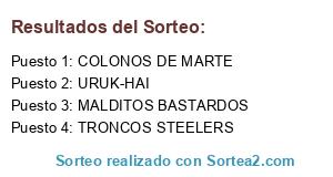 Lista de participantes: MALDITOS BASTARDOS, URUK-HAI, COLONOS DE MARTE, TRONCOS STEELERS.