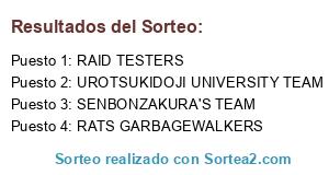 Lista de participantes: UROTSUKIDOJI UNIVERSITY TEAM, RATS GARBAGEWALKERS, SENBONZAKURA'S TEAM, RAID TESTERS.