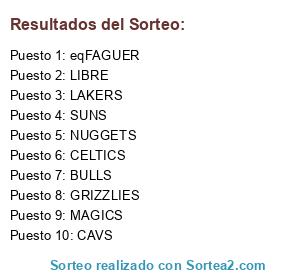 Lista de participantes: MAGICS, CELTICS, LAKERS, GRIZZLIES, SUNS, BULLS, CAVS, NUGGETS, eqFAGUER, LIBRE.