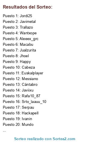 Lista de participantes: Aleeex_grc, AlexRamos, Macabu, Ivanin, Zuri25, Happy, Davichu, Wantxope, Javimetal, Mundo, Jualzurita, Serpau, Rafa10_87, Srto_laauu_10, Messiano, Javiixu, Euskalplayer, Jordi25, Hackapell, Trallazo, Cántabro, Damiolp, Jhoel, Cabeza.