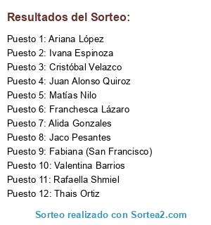 Lista de participantes: Jaco Pesantes, Ivana Espinoza, Juan Alonso Quiroz, Ariana López, Fabiana (San Francisco), Thais Ortiz, Valentina Barrios, Cristóbal Velazco, Rafaella Shmiel, Matías Nilo, Alida Gonzales, Franchesca Lázaro.