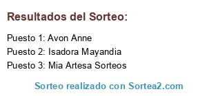 Lista de participantes: Charo Romero Álvarez, Veronica Sumillera, Rosa Nieto, Mari Casado Diaz, Núria Garcia, Sandra Collado Gonzalez, Isadora Mayandia, Vanessa Maria, Marian Cosmeticos, Monica Rodriguez Portela, Miriam Abad Navarro, Sonia Méndez Rodríguez, Mariló Salmerón Fernández, Valeria Mayrock Lopinto, Belén Belén, Luisa Fluixa, Yoli Olid, Alba Serrano, Maribel Pedrera, Pepi Romero Alvarez, Javier Gonzalez, Soledad Rodriguez Lopez, Gemma ML, Merce Julián Natalia cuello, Lucia Xaica, Agnes Salva Fiol, Belen Garcia Luque, Marta Alonso Garcia, María Teresa Romero Sánchez, Maria Ortega Gomez, Mónica Prieto García, Rosa María Sierra Álvarez, Macarena Soria, Belen Martín-Serrano, Cintia Soto Saiz, Mami Duna Carolina, Barbara Llana, Pilar Castillo Porras, Eva Lg Elgjca, Vanesa Molina Palao, MariaRosa Fdz Lasquetty Blanc, Belum Complementos, Clara Arrankando Polvareda, Edu Fernández Abril, Ana Maria Gata Martin, Alicia López Bea, Lola Castella Sebastia, Maria Eugenia Arias Lozano, Edu fernandez Abril, Charo Romero Alvarez, Alicia Lopez Bea, Kamal Sev, Nuria Garcia, Buscador de sorteos, Nagore arostegui, Chelo Moa, Concepción Matias Simarro, Nieves López, Avon Anne, Rosa Maria Sierra Alvarez, Kapitana Korsaria Pirates, Pilar Moreno Madrid, Alicia Carrero marcos, Mónica Prieto Garcia, Veronica de Carolis, Mia Artesa Sorteos, Nuria Esteve Mari Casado Diaz, Eneida Calleja Blas, Julia Lanzas Orejuela, Hecho A mano Tamara, Dolores Maldonado Amaya.