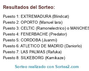 Lista de participantes: OPORTO (Manuel lara), CELTIC (Ramonelectrico) o MANCHESTER UNITED (Pescaito), SILKEBORG (Kamikaze), EXTREMADURA (Blindcat), FENERBACHE (Predator), ATLETICO DE MADRID (Daniorlo), LAS PALMAS (Rafuka), CORDOBA (Juanmi).