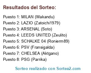Lista de participantes: MILAN (Wakandu), LAZIO (Zatoichi1979), ARSENAL (Soto), SCHALKE 04 (Ronierm89), CHELSEA (Aktgano), LEEDS UNITED (Zeulito), PSG (Parrika), PSV (Fransigalda).