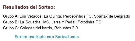 Lista de participantes: La Squadra, Percebinhos FC, Colegas del barrio, La Quinta, Robustos 2.0, Los Vetados, Spartak de Belgrado, Jarra Y Pedal, Pototinha F.C, IVC.