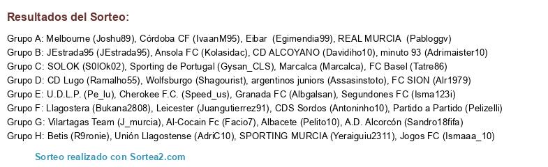 Lista de participantes: Leicester (Juangutierrez91), JEstrada95 (JEstrada95), argentinos juniors (Assasinstoto), SOLOK (S0lOk02), CD Lugo (Ramalho55), A.D. Alcorcón (Sandro18fifa), Wolfsburgo (Shagourist), Betis (R9ronie), SPORTING MURCIA (Yeraiguiu2311), minuto 93 (Adrimaister10), U.D.L.P. (Pe_lu), Eibar (Egimendia99), Segundones FC (Isma123i), Albacete (Pelito10), REAL MURCIA (Pabloggv), Marcalca (Marcalca), CD ALCOYANO (Davidiho10), CDS Sordos (Antoninho10), Ansola FC (Kolasidac), Llagostera (Bukana2808), Granada FC (Albgalsan), Cherokee F.C. (Speed_us), FC Basel (Tatre86), Jogos FC (Ismaaa_10), FC SION (Alr1979), Al-Cocain Fc (Facio7), Unión Llagostense (AdriC10), Partido a Partido (Pelizelli), Sporting de Portugal (Gysan_CLS), Córdoba CF (IvaanM95), Melbourne (Joshu89), Vilartagas Team (J_murcia).