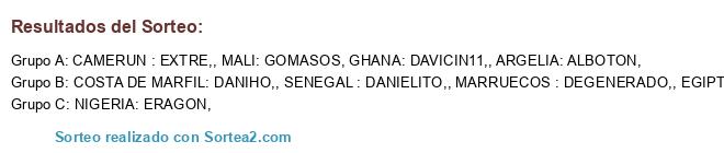 Lista de participantes: ARGELIA: ALBOTON,, CAMERUN : EXTRE,, COSTA DE MARFIL: DANIHO,, EGIPTO: MOIDECAI,, GHANA: DAVICIN11,, MARRUECOS : DEGENERADO,, NIGERIA: ERAGON,, SENEGAL : DANIELITO,, MALI: GOMASOS.