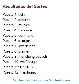 Lista de participantes: monchengladbach, hamburgo, munich, wolfsburgo, koln, bremen, sttutgart, hannover, dortmund, schalke, leverkusen, EXENTO.