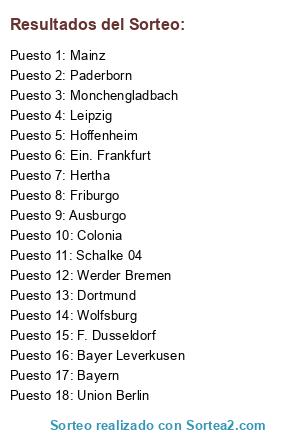Lista de participantes: Colonia, Mainz, Bayer Leverkusen, Dortmund, Ein. Frankfurt, F. Dusseldorf, Ausburgo, Bayern, Schalke 04, Hertha, Monchengladbach, Paderborn, Leipzig, Friburgo, Hoffenheim, Union Berlin, Wolfsburg, Werder Bremen.