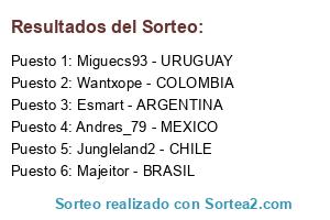 Lista de participantes: Majeitor - BRASIL, Esmart - ARGENTINA, Miguecs93 - URUGUAY, Wantxope - COLOMBIA, Jungleland2 - CHILE, Andres_79 - MEXICO.