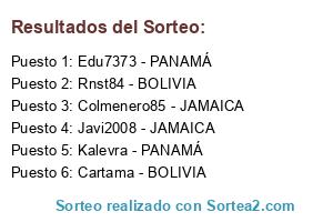 Lista de participantes: Javi2008 - JAMAICA, Colmenero85 - JAMAICA, Rnst84 - BOLIVIA, Cartama - BOLIVIA, Edu7373 - PANAMÁ, Kalevra - PANAMÁ.