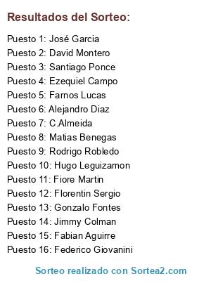 Lista de participantes: Farnos Lucas, Matias Benegas, Hugo Leguizamon, Alejandro Diaz, José Garcia, C.Almeida, Jimmy Colman, Rodrigo Robledo, Gonzalo Fontes, Fabian Aguirre, Florentin Sergio, Fiore Martin, Ezequiel Campo, Santiago Ponce, David Montero, Federico Giovanini.