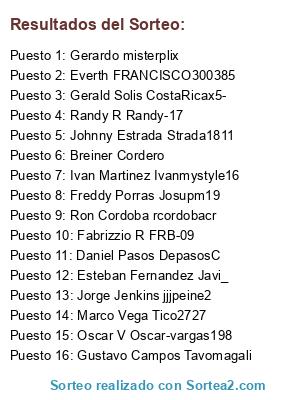 Lista de participantes: Marco Vega Tico2727, Everth FRANCISCO300385, Breiner Cordero, Ron Cordoba rcordobacr, Jorge Jenkins jjjpeine2, Oscar V Oscar-vargas198, Gerardo misterplix, Freddy Porras Josupm19, Esteban Fernandez Javi_, Fabrizzio R FRB-09, Johnny Estrada Strada1811, Ivan Martinez Ivanmystyle16, Gustavo Campos Tavomagali, Gerald Solis CostaRicax5-, Daniel Pasos DepasosC, Randy R Randy-17.