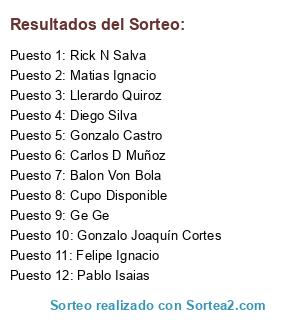 Lista de participantes: Gonzalo Castro, Rick N Salva, Ge Ge, Llerardo Quiroz, Pablo Isaias, Carlos D Muñoz, Felipe Ignacio, Diego Silva, Matias Ignacio, Gonzalo Joaquín Cortes, Balon Von Bola, Cupo Disponible.