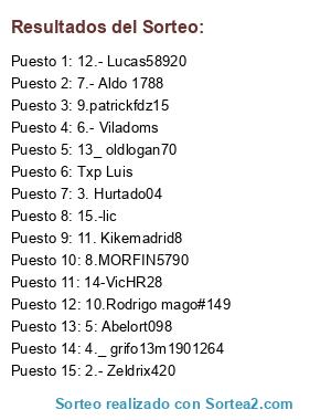 Lista de participantes: Txp Luis, 2.- Zeldrix420, 3. Hurtado04, 4._ grifo13m1901264, 5: Abelort098, 6.- Viladoms, 7.- Aldo 1788, 8.MORFIN5790, 9.patrickfdz15, 10.Rodrigo mago#149, 11. Kikemadrid8, 12.- Lucas58920, 13_ oldlogan70, 14-VicHR28, 15.-lic.
