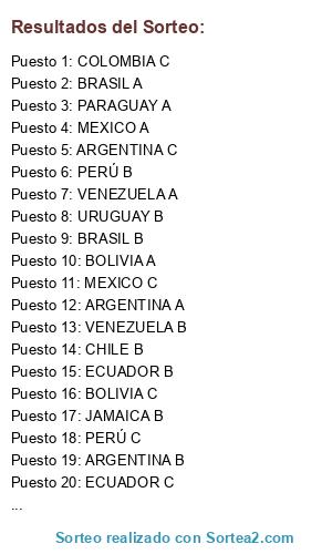 Lista de participantes: CHILE A, CHILE B, CHILE C, MEXICO A, MEXICO B, MEXICO C, ECUADOR A, ECUADOR B, ECUADOR C, BOLIVIA A, BOLIVIA B, BOLIVIA C, ARGENTINA A, ARGENTINA B, ARGENTINA C, URUGUAY A, URUGUAY B, URUGUAY C, PARAGUAY A, PARAGUAY B, PARAGUAY C, JAMAICA A, JAMAICA B, JAMAICA C, BRASIL A, BRASIL B, BRASIL C, PERÚ A, PERÚ B, PERÚ C, COLOMBIA A, COLOMBIA B, COLOMBIA C, VENEZUELA A, VENEZUELA B, VENEZUELA C.