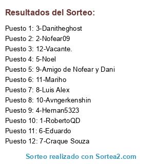 Lista de participantes: 1-RobertoQD, 2-Nofear09, 3-Danitheghost, 4-Hernan5323, 5-Noel, 6-Eduardo, 7-Craque Souza, 8-Luis Alex, 9-Amigo de Nofear y Dani, 10-Avngerkenshin, 11-Mariho, 12-Vacante..