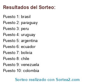 Lista de participantes: argentina, bolivia, brasil, chile, colombia, ecuador, paraguay, peru, uruguay, venezuela.