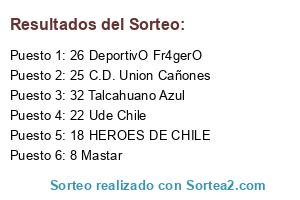 Lista de participantes: 1 escudo de acero F.C, 2 Capelitros F.C., 3 xunxolacticos fc, 4 tirualbos, 5 C. de F. Rangers de Talca, 7 real varllenalo, 9 San Vicente Norte, 10 VAGO F.C.