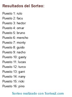Lista de participantes: nany, turco, ricki, rulo, monty, pino, gasty, facu, nacho, mencho, omar, guido, bruno, hector, garri, lucas.