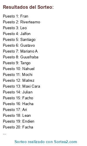 Lista de participantes: Santiago, Pueblito, Fran, Andy, Tango, Jairo, Facho, Jalfon, Hacha, Gustavo, Matrez, Julian, Leo, Lean, Mochi, TeeKa, Maxi Cara, Riverteamo, Facha, Nacho, Ari, Pato, Mariano A, Nahuel, Endien, Guusfraba.