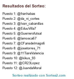 Lista de participantes: @CFansdelmago6 , @JuandaMoral , @kikus_93 , @da_ni_cortes , @josetorres_71 , @EduuVilla7 , @lamosca67 , @Ivan_cabanillas , @CR23Lopez , @Guerrerofutsal , @11TiareValencia , @franhabas , .
