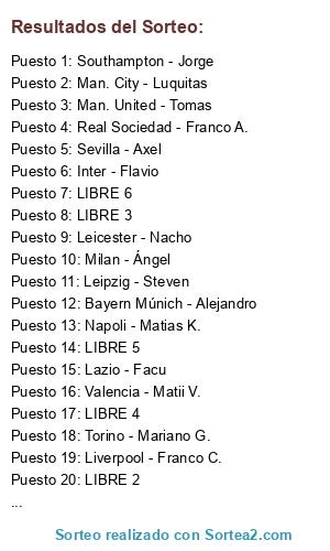 Lista de participantes: Ajax - Ignacio, Atalanta - Ezequiel, B. Dortmund - Mariano M., Barcelona - Pablo, Bayern Múnich - Alejandro, Chelsea - Fifa, Inter - Flavio, Juventus - Mauricio, Lazio - Facu, Leicester - Nacho, Leipzig - Steven, LIBRE 1, LIBRE 2, LIBRE 3, LIBRE 4, LIBRE 5, LIBRE 6, Liverpool - Franco C., Man. City - Luquitas, Man. United - Tomas, Milan - Ángel, Napoli - Matias K., PSG - Leo, Real Madrid - Nahuel, Real Sociedad - Franco A., Roma - Damian, Sevilla - Axel, Southampton - Jorge, Torino - Mariano G., Tottenham - Santy, Valencia - Matii V., Villarreal - Adalberto.